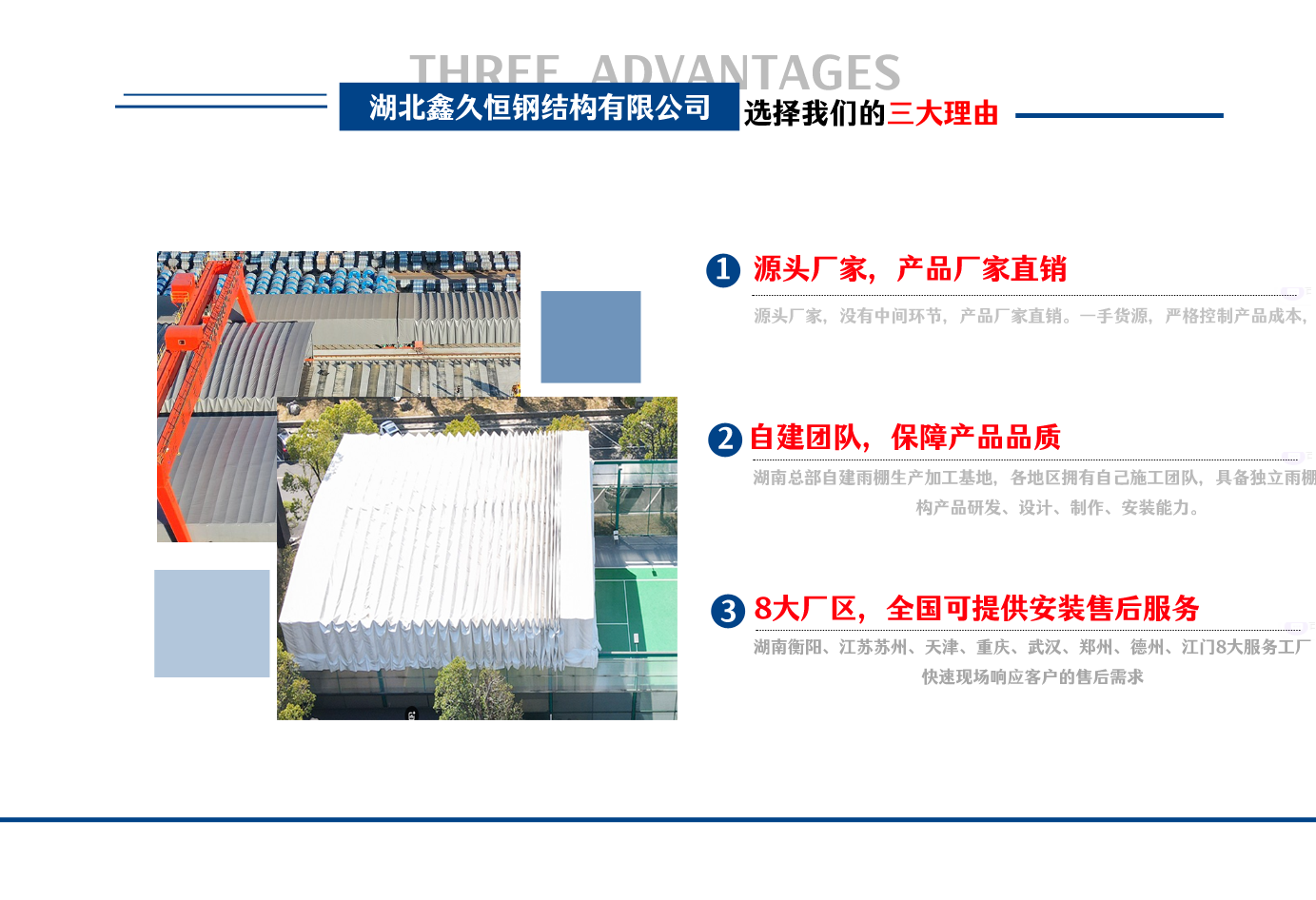湖北鑫久恒鋼結構有限公司是一家電動雨棚、膜結構車棚研發,生產銷售,施工安裝于一體的專業鋼結構科技公司,主要產品有伸縮雨棚,電動雨棚,膜結構車棚等。 湖南地區職員目前有80多人,占地面積20000平方米,廠房面積15600平方米,配備先進的生產流水線,使每件品質產品的堅實基礎。 公司在蘇州、天津、重慶、武漢、德州、烏魯木齊、江門均設有服務工廠,總人員共300多人,擁有專業的技術團隊,配備先進的設備和流水線生產,產能高,貨源充足,發貨速度快,服務區域廣。 移動伸縮棚適用于通道臨時倉儲、戶外運動遮陽、污水池遮蓋、能源交通、熱力化工、礦山、船舶制造及市政建設、物流、碼頭等領域的構件制作加工,成品半成品存放、倉庫、野外儀器設備操作用房等。尤其是對工廠發貨、倉儲臨時遮雨防嗮,梅雨期較長、建設周期較短的工程施工等特別適用。還可根據用戶需求量身定制、適合企業所需不同款式的產品。 我公司堅持“誠信社會為本,客戶滿意為榮”的經營理念,做到質量把控,嚴格管理,精益求精,恪守承諾。使鑫久恒逐步走向成熟,其系統化、專業化日趨完善。以專業的技術、科學的管理,更高的產品質量,優良的企業信譽,真誠的客戶服務,靈活多樣的經營方式和務實創新的企業精神愿與社會各界攜手合作,為推動智能鋼結構建筑事業的發展而不斷努力。...